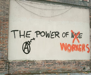 Quienes trabajamos, tenemos poderes, nos recuerda esta pintada del Poblenou de Barcelona.